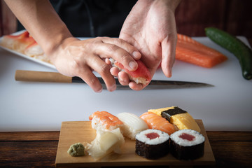 大将は手を鳴らして拍子をとりながら、無口に寿司を握っています。